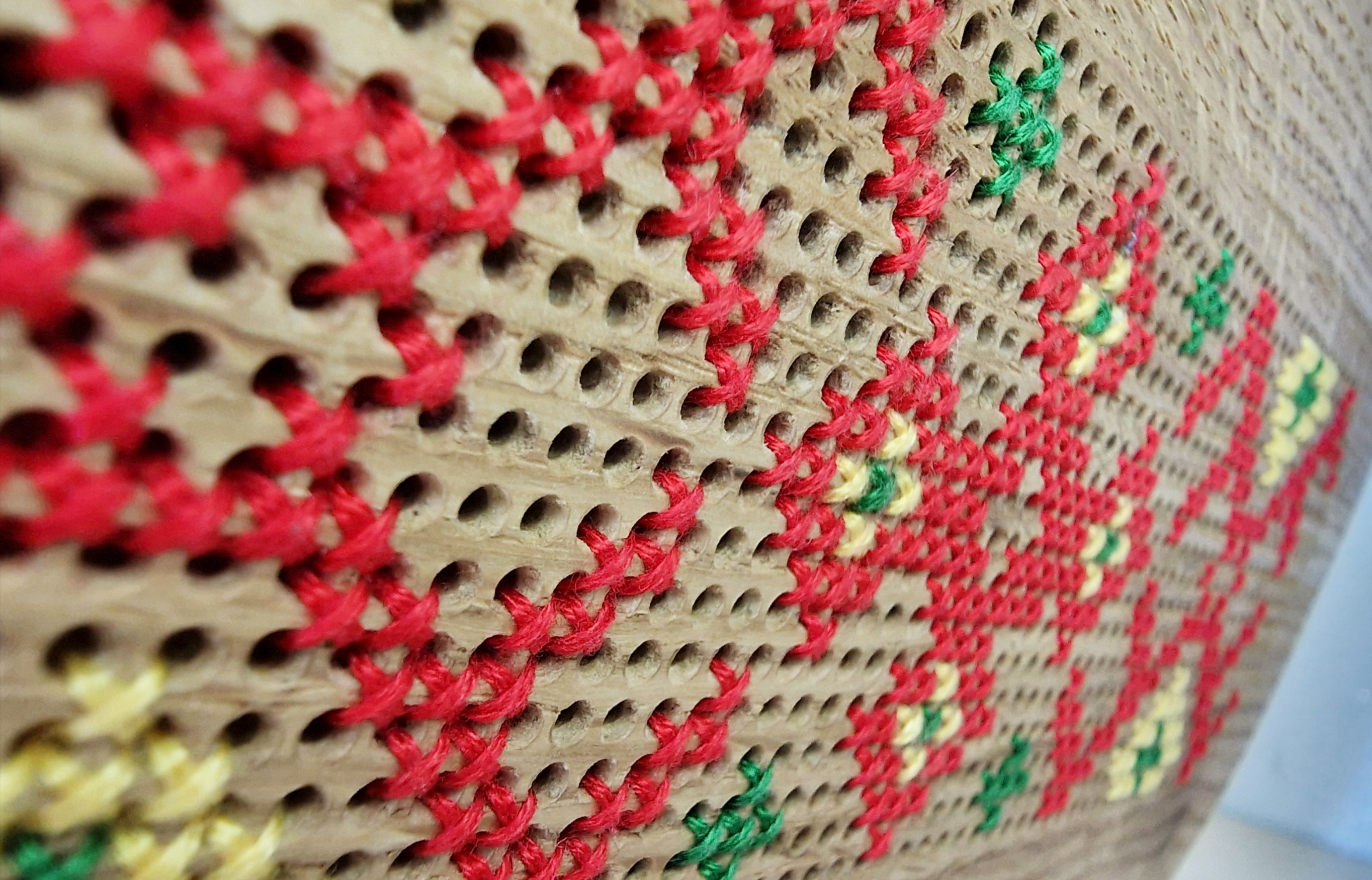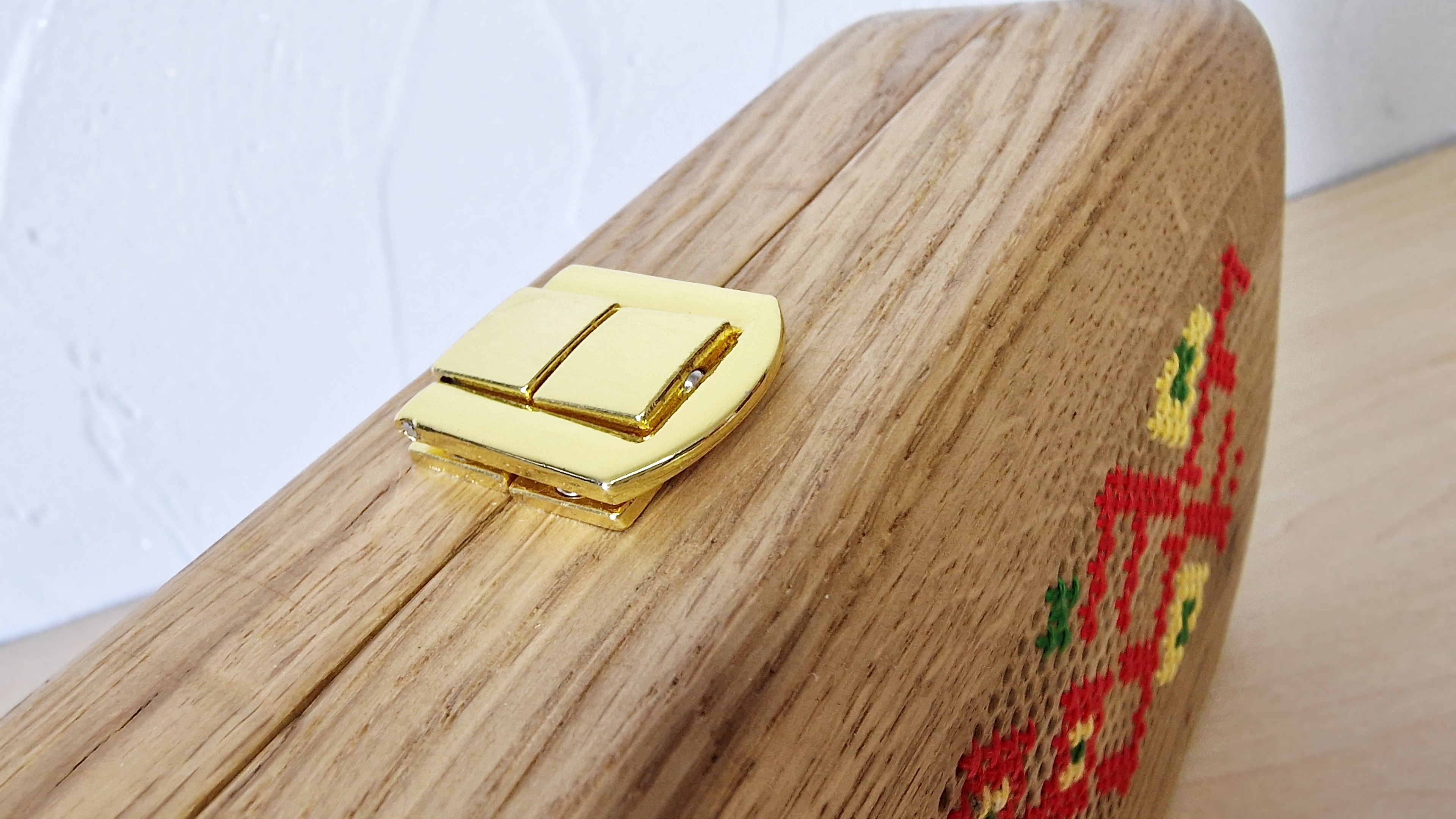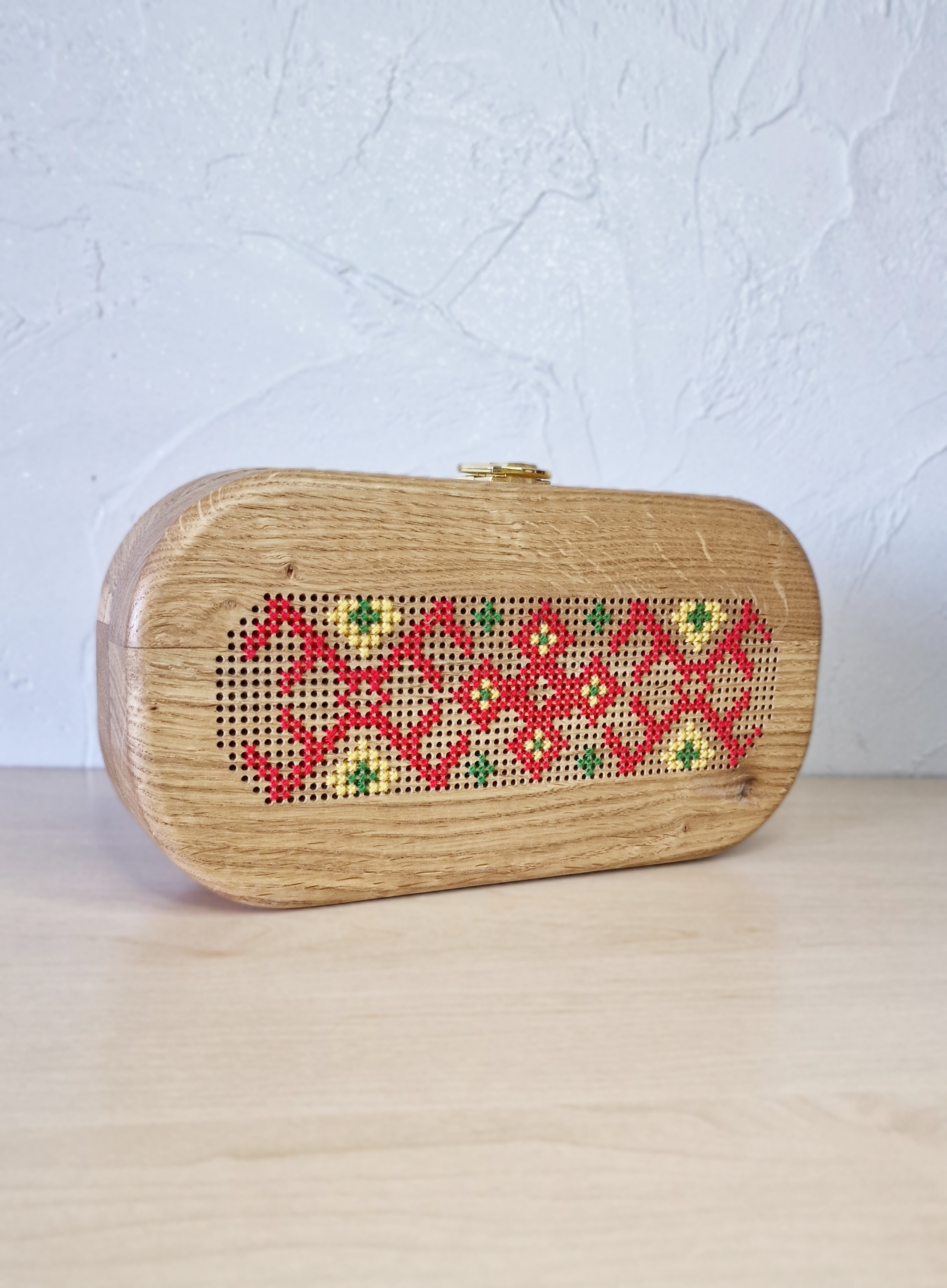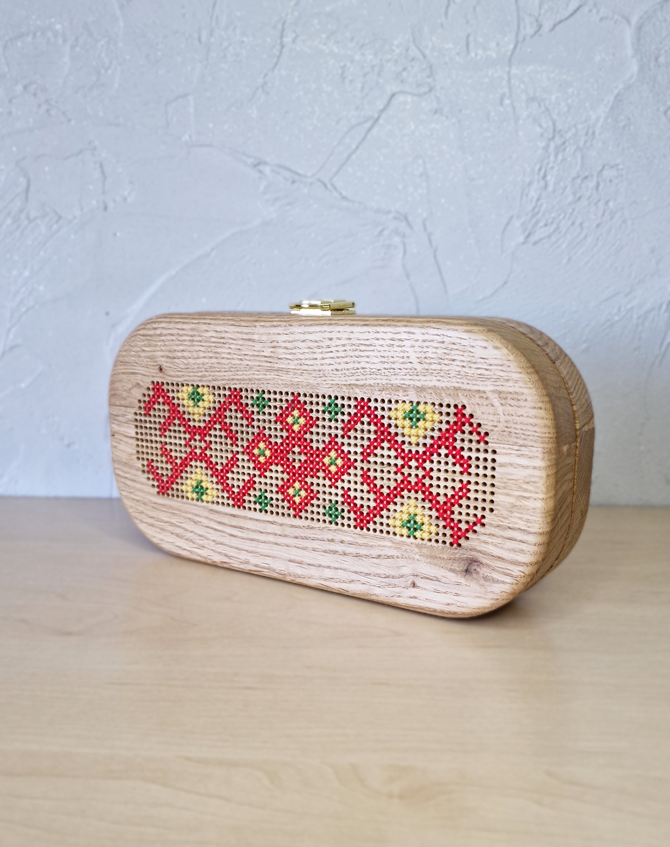 Maža forma – didelė prasmė. Ši ąžuolinė delninė dekoruota siuvinėtais tautinės juostos motyvais, perkeltais į šiuolaikišką, minimalistinį dizainą.