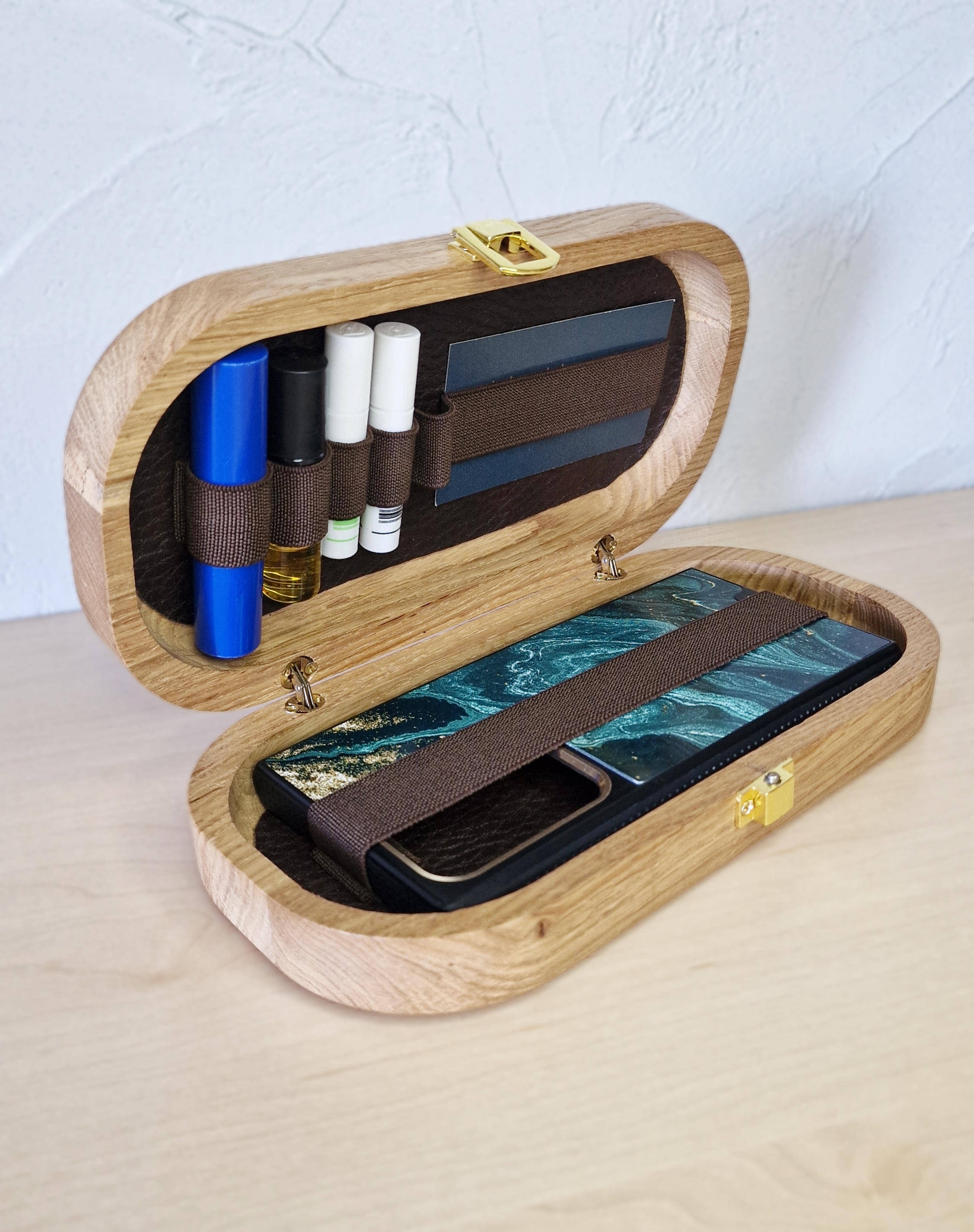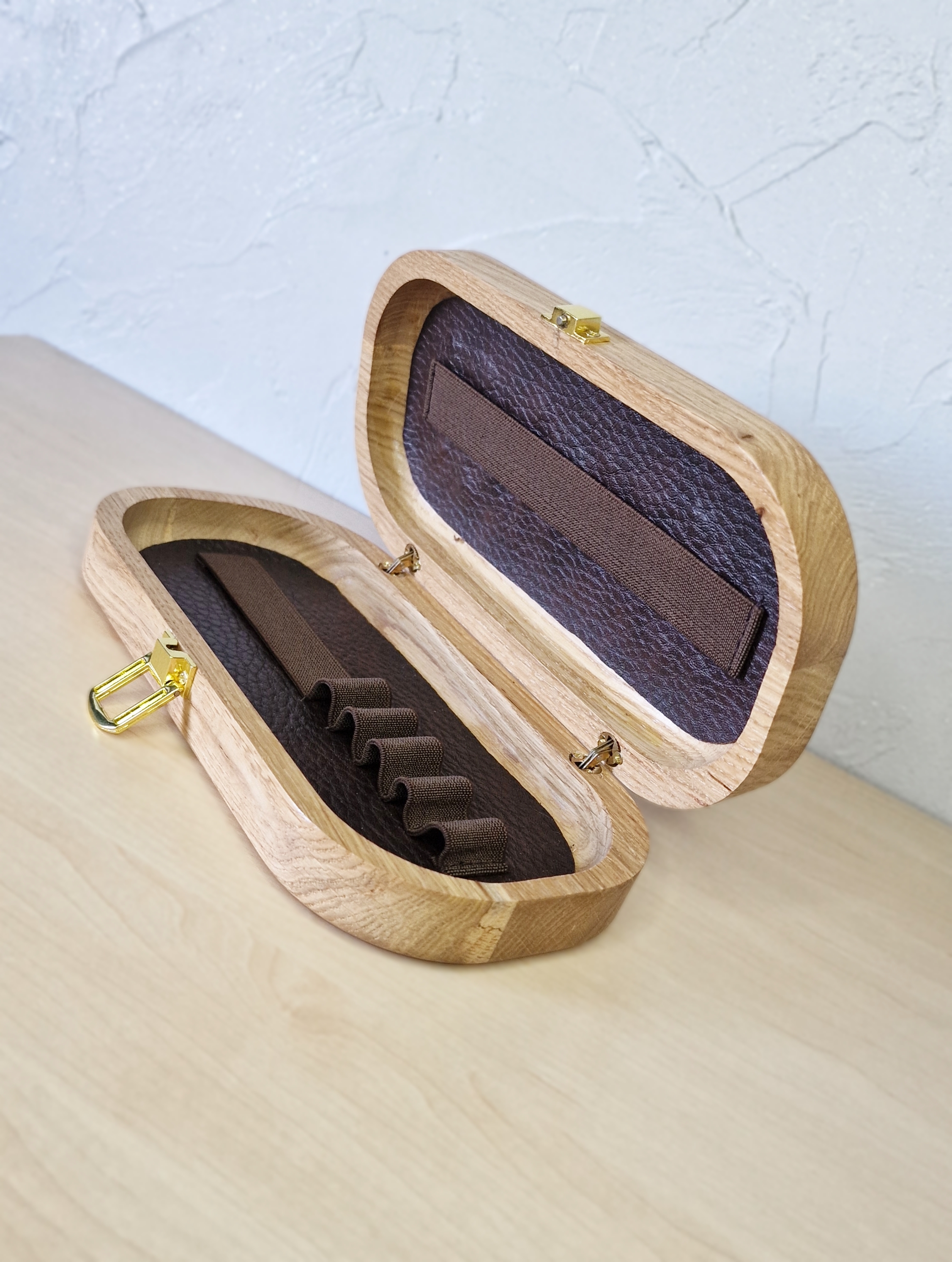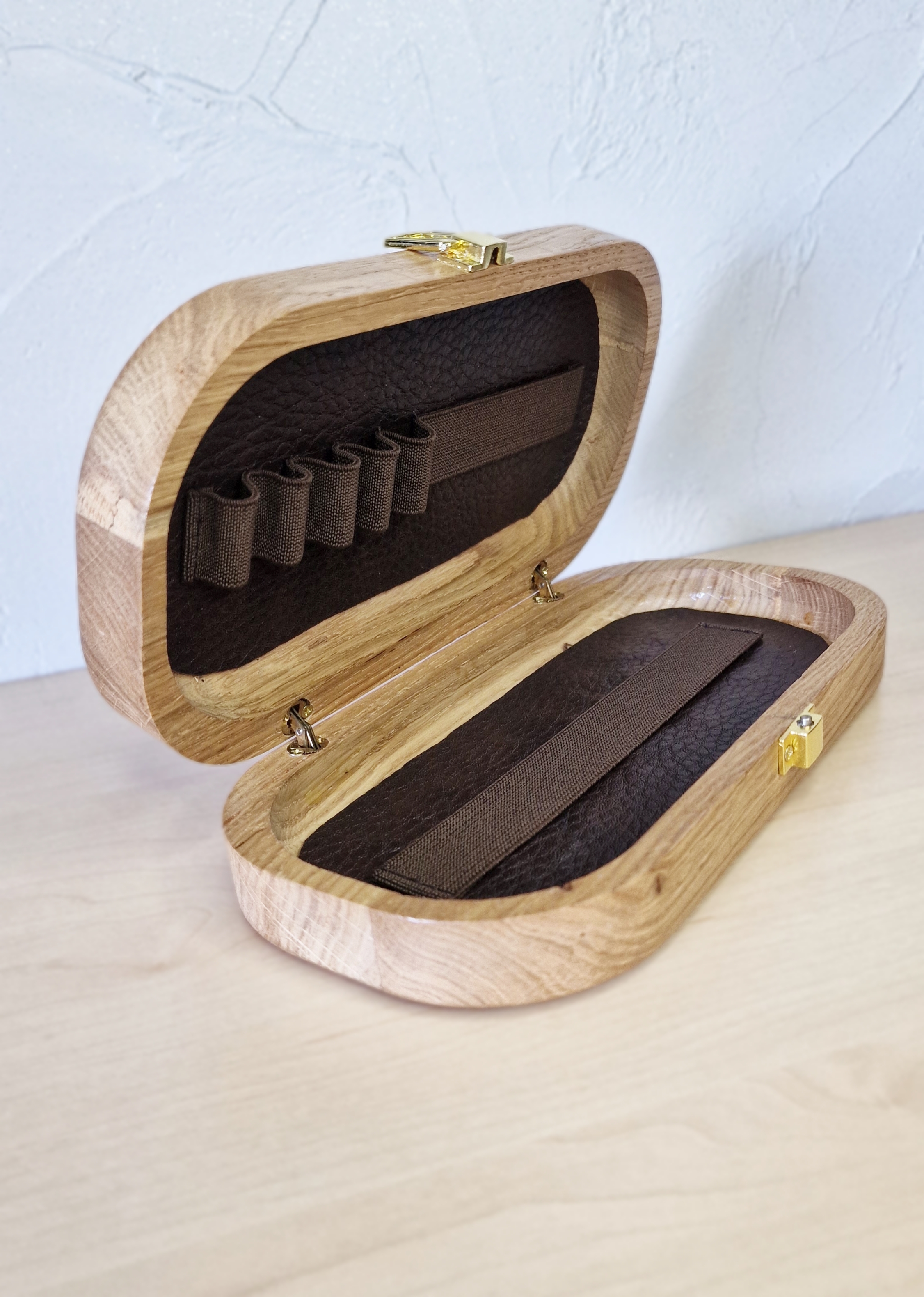Medžiagos: Natūralus ąžuolas, oda, medvilnės siūlai, metalinės detalės